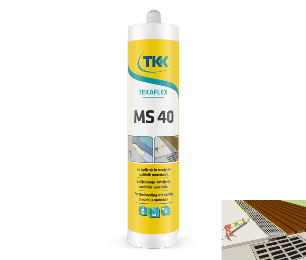 Η μαστίχη Tekaflex MS 40 χρησιμοποιείται για αρθρώσεις διαστολής σε κατασκευές, αυτοκινητοβιομηχανία και κατασκευή σκαφών. Είναι κατάλληλη για σφράγιση και κόλληση διαφόρων υλικών, όπως πάνελ και στέγες.