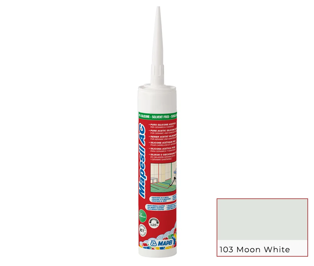 MAPESIL AC, καθαρή σιλικόνη οξικού πολυμερισμού χωρίς διαλύτες. Ιδανική για κεραμικά πλακίδια, σε εσωτερικούς και εξωτερικούς χώρους, για υγρό περιβάλλον και πισίνες. Για ανθεκτικό σφράγισμα που παραμένει αναλλοίωτο στον χρόνο.